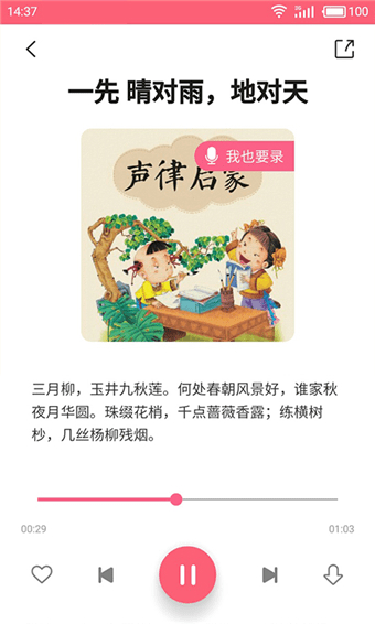 声律启蒙诵读app——好用的声律启蒙教育应用,帮助孩子掌握声律,方便孩子享受优质的声律音频,由千万妈妈共同创作分享。孩子的声律启蒙教育从这里开始。