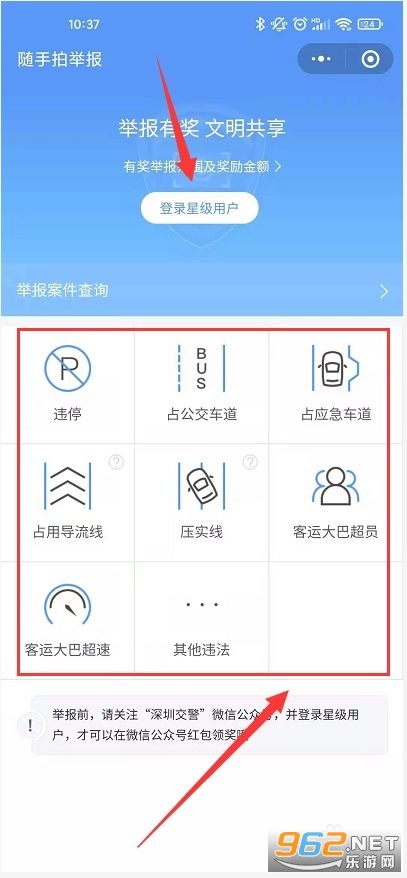 请务必登录星级账户(若未登录将无法领取红包),登录后选择具体违法项目进行拍照上传即可。