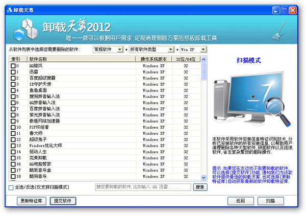 卸载特征库是卸载天尊软件最重要的组成部分并且软件内部拥有强大的卸载引擎,该卸载引擎是依靠丰富的卸载特征库来运行并识别分析目标软件的安装信息以及已卸载软件的残留信息.这个丰富的卸载特征库先阶段由广大热心网友通过云服务提交软件样本供给卸载天尊团队进行分析入库.目前卸载特征库支持百款流行软件的残留扫描识别.