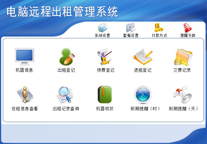 《电脑远程出租管理系统》为了方便远程外租电脑的用户,对电脑现状实时查询管理。软件功能具体包括:基础设置:系统设置、套餐类型、付款方式和提醒天数。业务管理:机器信息、出租登记、续费登记、退租登记、交费记录、在租信息查看、出租记录查询、机器现状和出租到期提醒。出租时为了方便用户把机器的配置及登录信息发给客户,自动整理这些信息供用户复制发给客户。在租的用户可以续费继续用。查询期间收费情况及汇总。查看所有机器的状态及出租到期时间不足一天或两个小时内到期提醒。