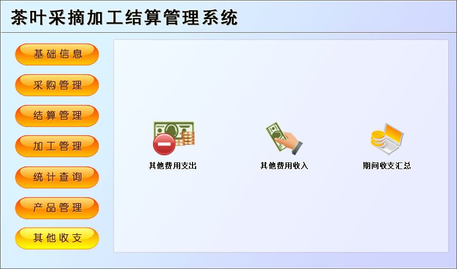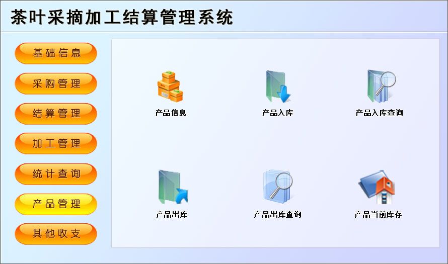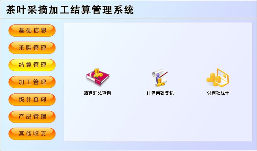 《茶叶采摘加工结算管理系统》是一款适用于中小茶叶采摘基地园管理工作的需要,主要包括基础信息、采购管理、结算管理、加工管理、产品管理等功能。本管理系统多处具有快速辅助录入功能,操作简单,易学、易用;处理功能高效强大,是协助您的好帮手!