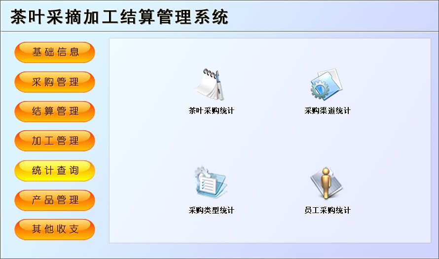 一、基础信息:供应商信息、茶叶品种、员工信息、客户信息二、采购管理:采购登记、今日采购明细、期间采购明细