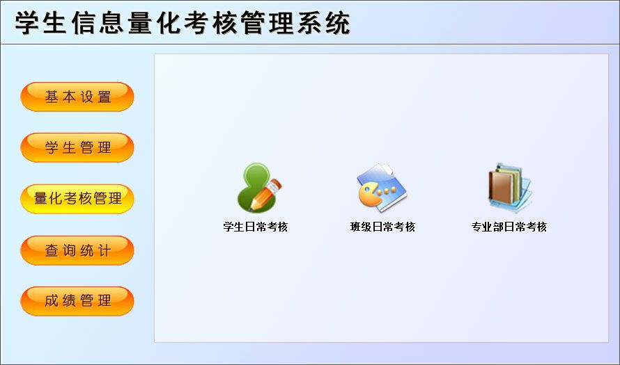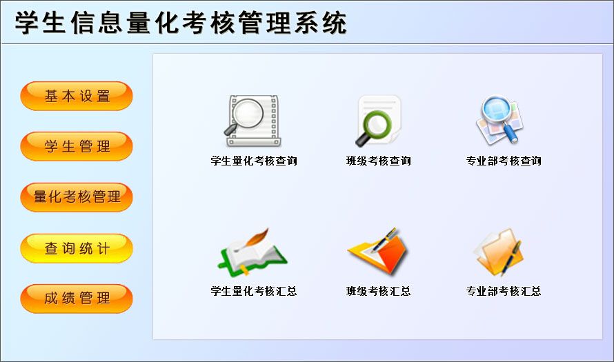 四、查询统计:学生量化考核查询、学生量化考核汇总、班级考核查询、班级考核汇总、专业部考核查询、专业部考核汇总