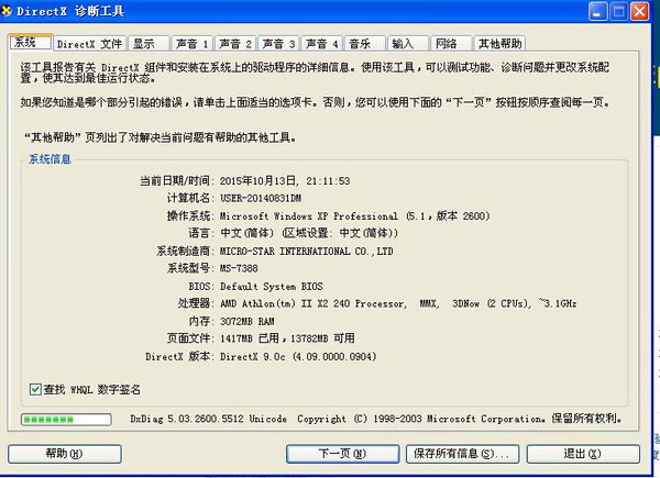 开始-运行-输入dxdiag,确认。在弹出的对话框中可以看到系统的DirectX版本(非硬件)