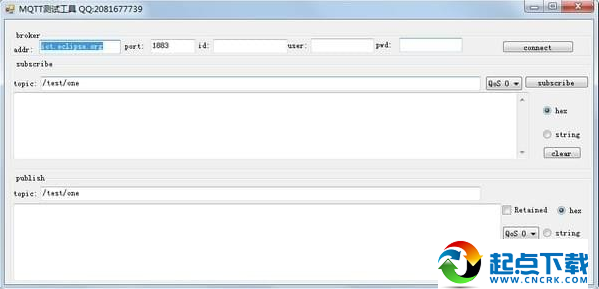 MQTT调试工具,用于MQTT协议联调联试,使用方便,画面简洁清晰,需要键入地址及端口号,ID/用户名及密码后连接,能够用来进行十六进制显示和ASCII显示,可以订阅MQTT topic!【软件特点】