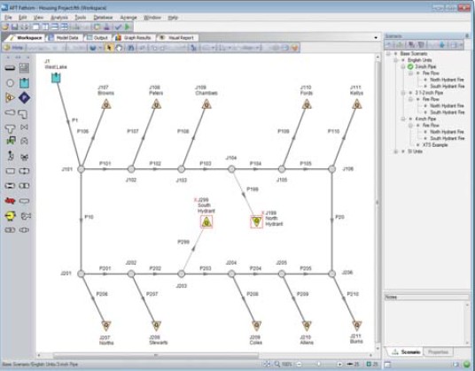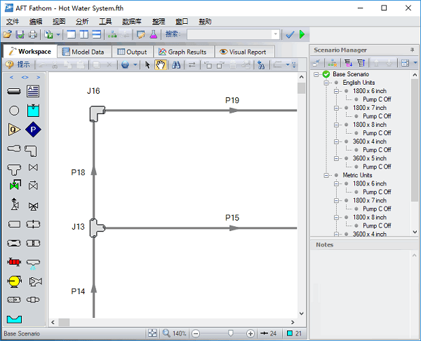 软件采用图形化的工作交互工作环境,用户采用拖放的方式建模。单元包括:无限大水池、储、分支、泵、换热器、给定流量元件、给定压力元件、变径、弯头、三通、阀门、止回阀、调节阀、盲端、孔板、文丘里管、滤网、喷头、通用阻力元件、用户定义。管网是由Junction(连接元件)和pipe(管道,包括延长阻力和局部阻力)构成,用户可以通过库来选择流体属性,或自定义流体属性。用户通过双击元件,即可设定其属性。用户可快速准确地设置管网系统的运行工况,如:阀、泵的开启和关闭,调节阀调节、闸阀的关闭或开启等。