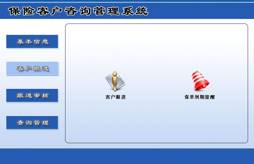 《保险客户咨询管理系统》是专门为保险行业跟进客户信息开发的一款软件。系统主要包含基本信息、客户根据、跟进审核、查询管理四大模块,信息录入简单明了,查询统计功能强大,让您操作简便、提高工作效率! 系统包含以下四大部分: 1.基本信息:员工信息、客户信息; 2.客户跟进:客户跟进、保单到期提醒; 3.跟进审核:当天跟进提醒、保单审核信息、已审核保单; 4.查询管理:按时间段查询客户信息、按时间段查询完结保单、按时间段查询业务员签单。