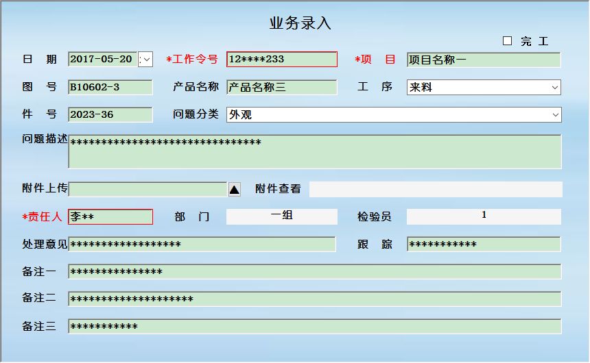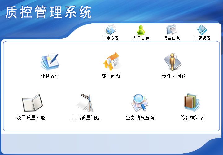 《质控管理系统》是为了方便一些生产型企业,对出现问题的产品做进一步处理,及在问题环节中涉及到的责任人进一步管理。 具体功能如下:基础设置:工序设置、人员信息、项目信息和问题设置。 信息管理:业务登记、部门问题、责任人问题、项目质量问题、产品质量问题、业务情况查询及综合统计表。 本软件支持与excel文件导入导出数据,支持图片等一些文件作为附件上传。本软件界面设计简洁、美观,操作简单、易学、易用。软件如不适合您的要求,可以根据您的要求调整软件或专门为您开发。
