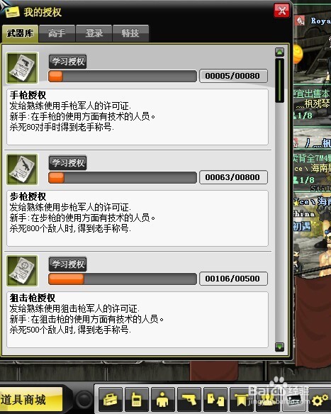 5、另外说说怎么购买枪支一开始只能买新手武器,点开右下角授权按钮,满足了授权条件就可以用更厉害的武器了