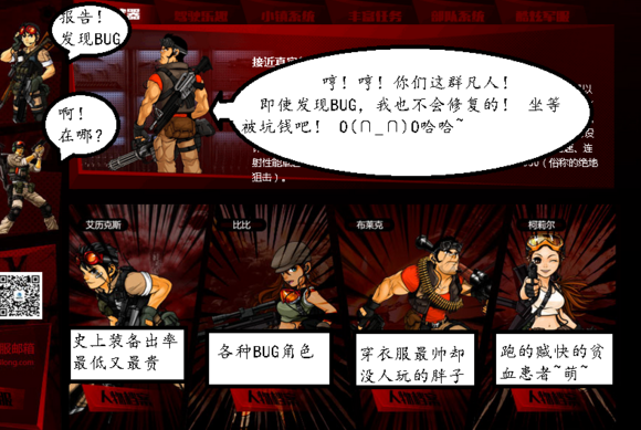 弹头奇兵,里面有许许多多“内容丰富”的服装系统,SWAT,USSF,沙漠装备,森林装备等。还有各种节日服装和特别服装,不同的服装就有不同的效果,譬如多加耐力,速度,精神力……至2009年服装有4种:白色背景(普通)蓝色背景(较好 任务里打出“补给卡片”,然后以抽奖的形式抽出来的)紫色背景(更好 商城里买的)红色背景(极品 任务里打出道具“A级 补给卡片” 然后以抽奖的形式抽出来的)。