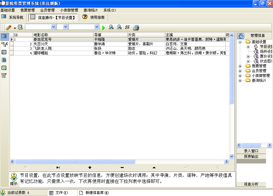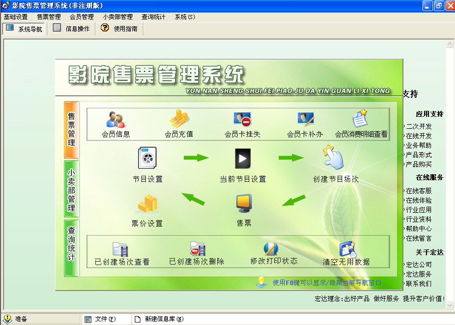 1.基础设置:节目设置、场所设置、票价设置、状态图示设置;对节目、票价、场所等售票所需的基础数据进行设置;2.售票管理:当前节目设置、创建节目场次、售票、清空无用数据;