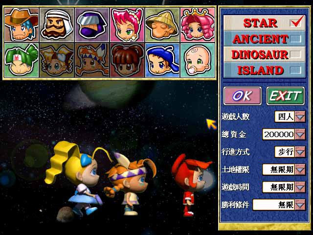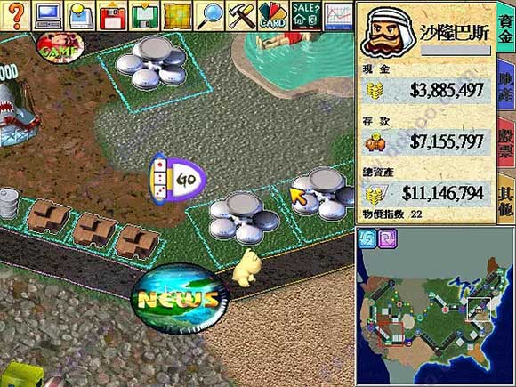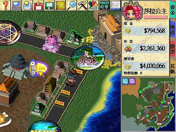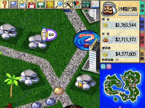 1.新建游戏后有12个人物可以选择,地图有4幅,分别为台湾、中国大陆、日本和美国,在资料片超时空之旅中又加入了四张新地图,分别是仙剑奇侠传、石器时代、星际宇宙、梦幻乐园。右边的选项决定游戏初期的难度和胜利条件。2.地图画面上方的按钮栏从左到右分别是帮助、选项、自动运行、调盘、存盘、全地图、查看人物资料、所有道具、所有卡片、出售栏、股市。