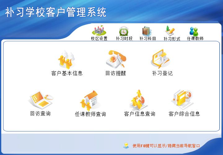 《补习学校客户管理系统》是一款针对补习学校管理客户信息的一款管理软件。软件集客户信息登记、回访登记、补习登记等功能与一体。软件界面设计简洁、美观其人性化的管理可以使用户轻易上手,大大节省工作时间,提高工作效率。科学的管理方法会给您带来无限的效益,补习学校客户管理系统将是您明智的选择。 《补习学校客户管理系统》包含:补习时段、补习科目、补习形式、任课教师、客户基本信息、回访提醒、补习登记、回访查询、任课教师查询、客户信息查询、客户综合信息等功能。
