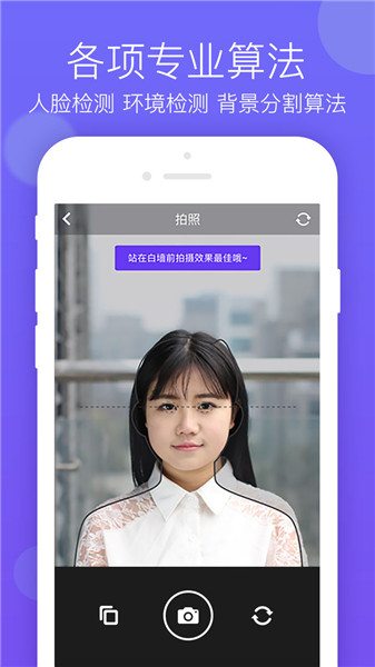 严格的拍摄环境检测,对人脸姿态、眼睛视线、双眼水平、服装突出、肩膀水平、光照充足、光线均匀进行检测,确保用户拍摄出合格的证件照。