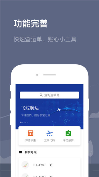 飞鲸专注于国内、国际航空运输,拥有全球庞大的服务网点,高覆盖,高效率,以追求卓越的精神为客户提供安全,经济,专业的航空运输订舱的服务。当前可以通过APP实现运单号查询、运单信息编辑、物流详情查询等操作;通过APP的站内消息,可以让用户及时掌握自己的运单处理情况,提高沟通处理效率。贴心的小工具功能,可以方便用户快速的计算体积重量、查询机场代码、换算单位,真正的让用户把业务管理起来。