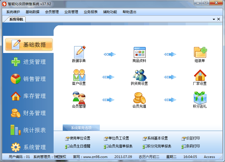 6、软件整合了零售收银、批发、采购、仓库、财务、人事、商品管理、查询与报表、系统维护等功能,协助您经营管理。