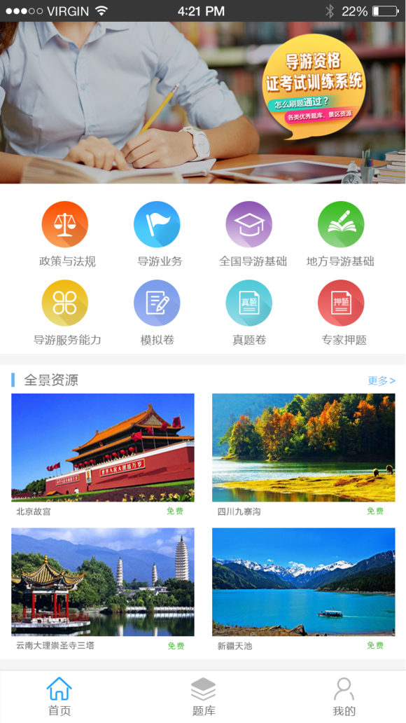1、简约设计,悦目娱心,灵动检索,资源极速锁定。2、五大科目,中英导游词,全国景区VR,你要的,无所不有。