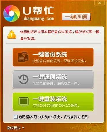 绿色免安装 功能强悍U帮忙一键备份还原系统:不用安装即可使用,绿色安全,兼容性强,功能完善。可在Win32(64)、WinPE、DOS 下对任意分区进行一键备份与还原,支持iso文件、光盘、U盘里的gho文件硬盘安装;支持设定密码保护、自定义热键等功能。