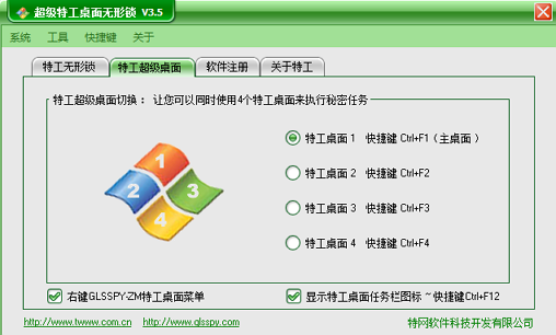 超级特工桌面无形锁给您提供四个特工超级桌面,您可以按您的需要让不同的秘密任务执行在不同的特工超级桌面上,可以快速切换到不同的超级桌面上,起到隐藏原来桌面任务的效果,例如:您上班使用QQ时,不想别人看到,有人来时,您就可以切换一下,并在新的桌面上办理其他事情。您可以使用不同的特工桌面来管理您的任务,如您可以在一个特工桌面办公,在第2个特工桌面上上网,在第3个特工桌面上玩游戏,在第4个...享受类似Linux操作系统多桌面的优点。