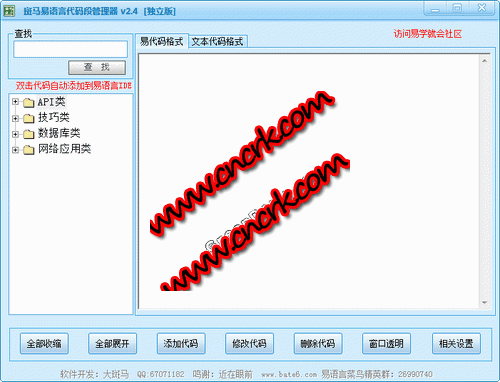 斑马易语言代码段管理器,是您学习易语言必不可少的一个工具,它使您的收藏代码不在混乱,查找 分类 和双击就可将代码发送到易语言代码界面,都是一个很方便的工具。