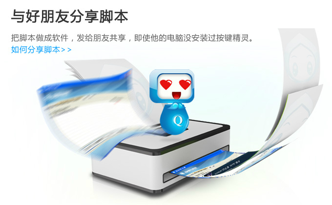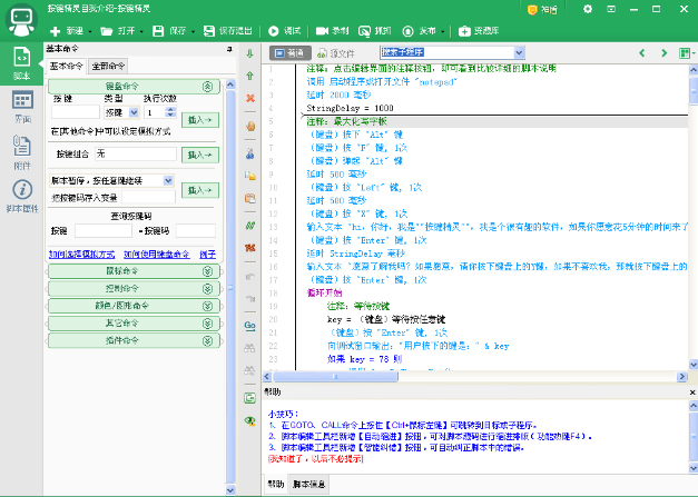 按键精灵可以帮您操作电脑,支持动作录制和回放功能。不需要任何编程知识就可以做出功能强大的脚本。只要您在电脑前用双手可以完成的动作,按键精灵都可以替您完成。按键精灵内置上百个命令,提供全界面化的操作,更有强大的插件功能扩展,数百位高手制作的上千款插件命令随时供您使用。只有您想不到,没有您找不到!脚本还能够生成独立的小精灵软件,可以发给朋友一起分享。