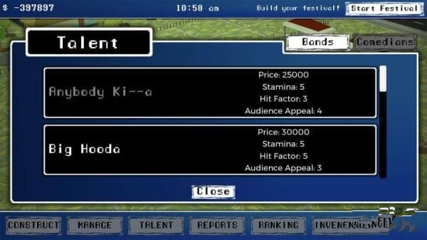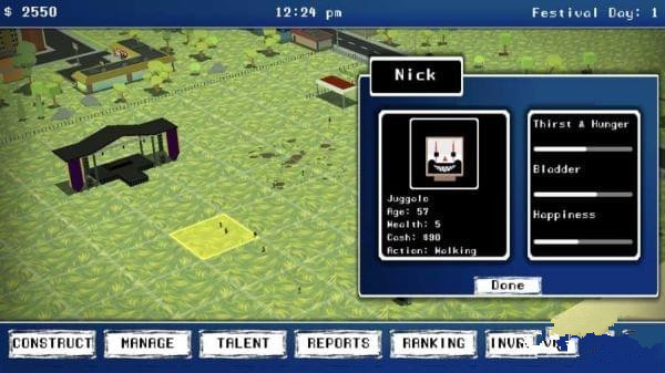 1、终极节日模拟。每个节日参加者都有自己的个性和生活方式,他们在饥饿时吃东西,在自然呼叫时去洗手间,在他们没钱的时候去ATM,等等;2、构建您的舞台和活动;