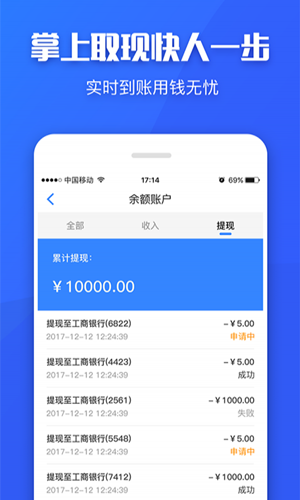 秒提现:应用内余额快速提现至指定银行账户,提现秒到账。