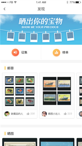 发现好物:分享晒图邮币藏品,获取藏友的点赞,发现别人的珍品,并与藏有交流收藏感悟