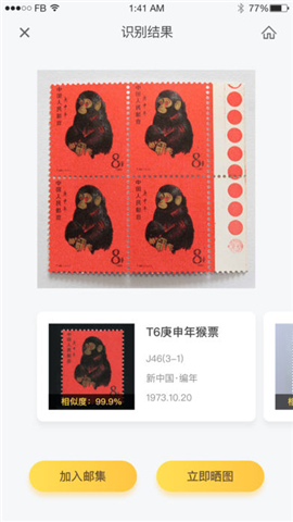 金猴识宝为邮票钱币爱好者、收藏家、从业者和大众用户提供简单便捷的邮币拍照识别功能,用户只需拍照即可知道邮票钱币的品种、名称、发行年份及估价等重要信息,APP还提供邮币的百科知识和智能集藏功能,为值得信赖的身边邮币智能专家。