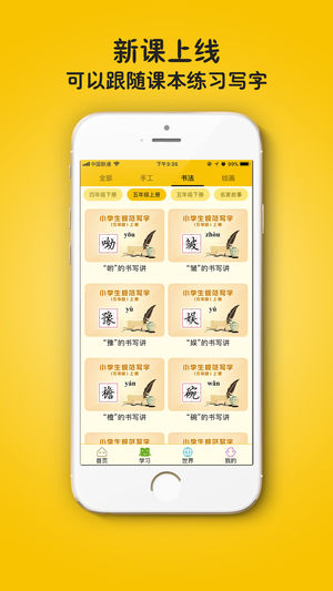 1. 观看教学视频孩子可以通过“学艺堂”观看系统权威的书法教学视频,同时可以在“学习”板块观看海量分类教学视频。