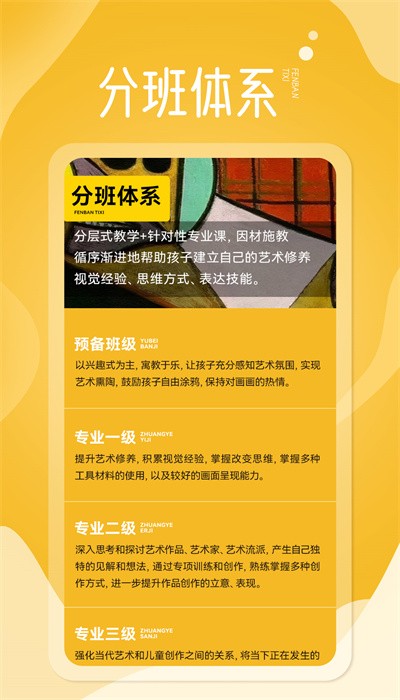 3、轻点“关于我们”页面,即可迅速知悉品牌理念、发展背景以及教学目标,为挑选契合孩子的艺术课程奠定认知与信任基石。