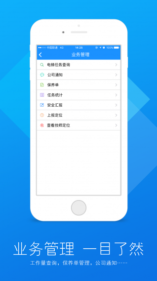 6.业务管理:工作量查询,保养单管理,公司通知。