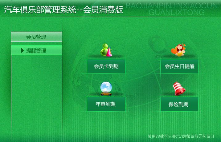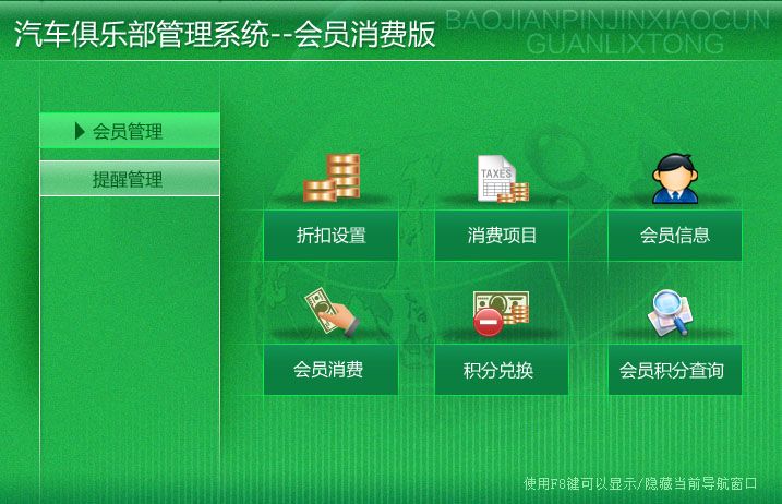 《汽车俱乐部管理系统--会员消费版》是专门针对汽车俱乐部、车友会的会员而开发的管理系统,该系统包括会员管理、提醒管理两大模块。系统配有业务帮助指导、图文并茂、全中文操作界面,无需计算机专业知识,使用简单易懂! 系统包括以下两部分: 1.会员管理:折扣设置、消费项目、会员信息、会员消费、积分兑换、会员积分查询 2.提醒管理:会员卡到期、会员生日提醒、年审到期、保险到期 软件特点: 1.支持数据与execel的导出与导入; 2.查询统计功能强大; 3.提醒功能方便快捷。