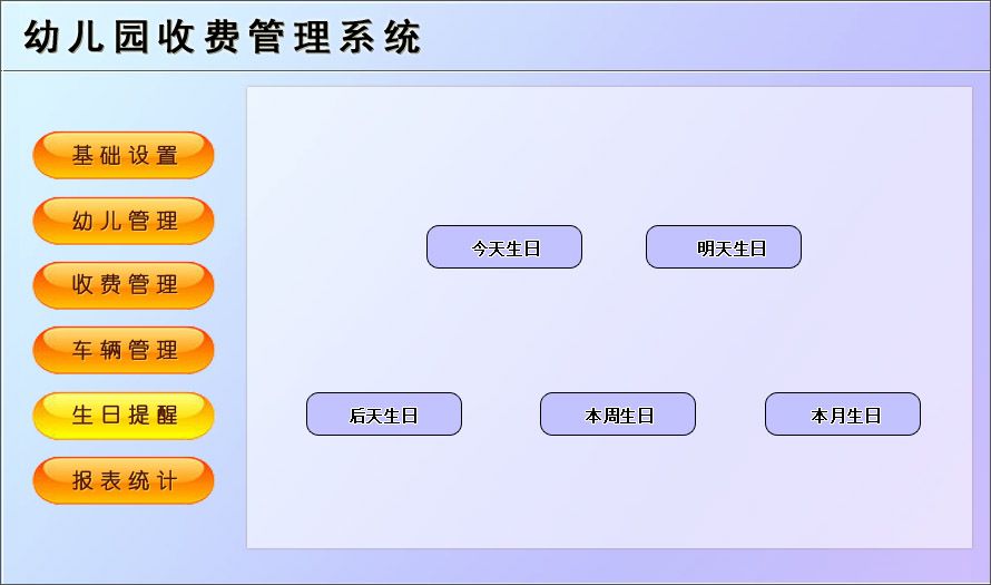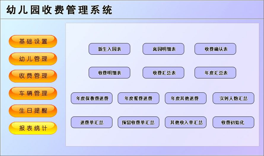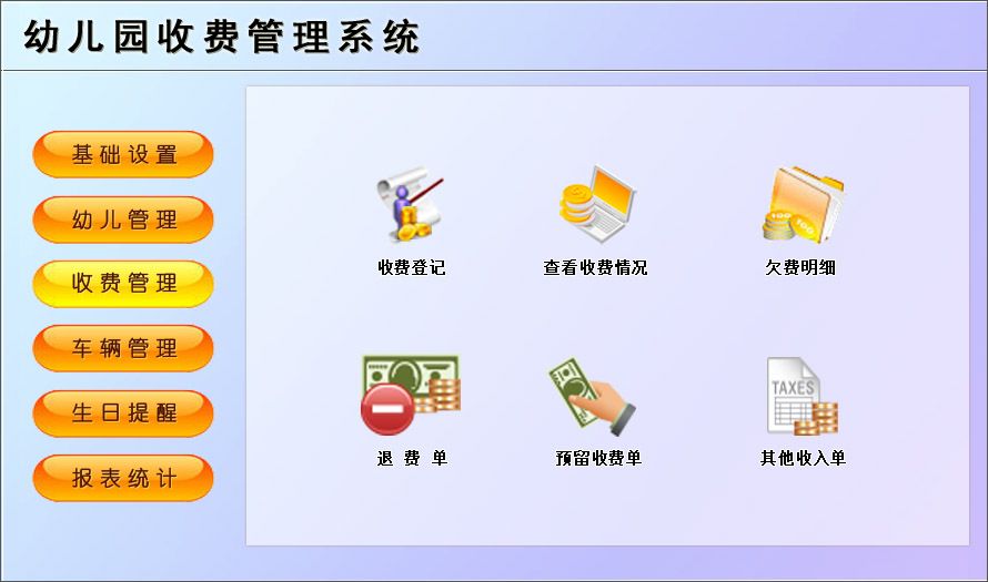 《幼儿园收费管理系统》适用于中小型幼儿园收费的管理软件。主要包含基础信息、幼儿管理、收费管理、车辆管理、生日提醒、报表统计等功能。本管理系统多处具有快速辅助录入功能,操作简单,易学、易用;处理功能高效强大,是协助您的好帮手!