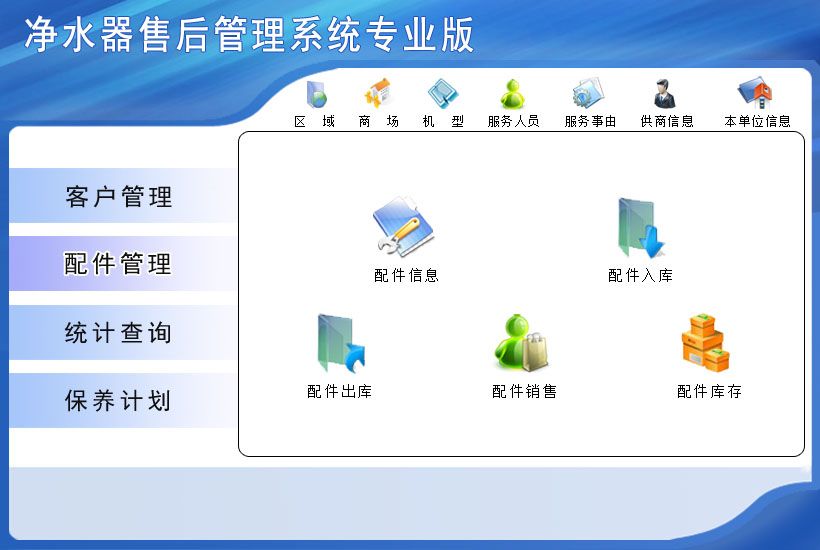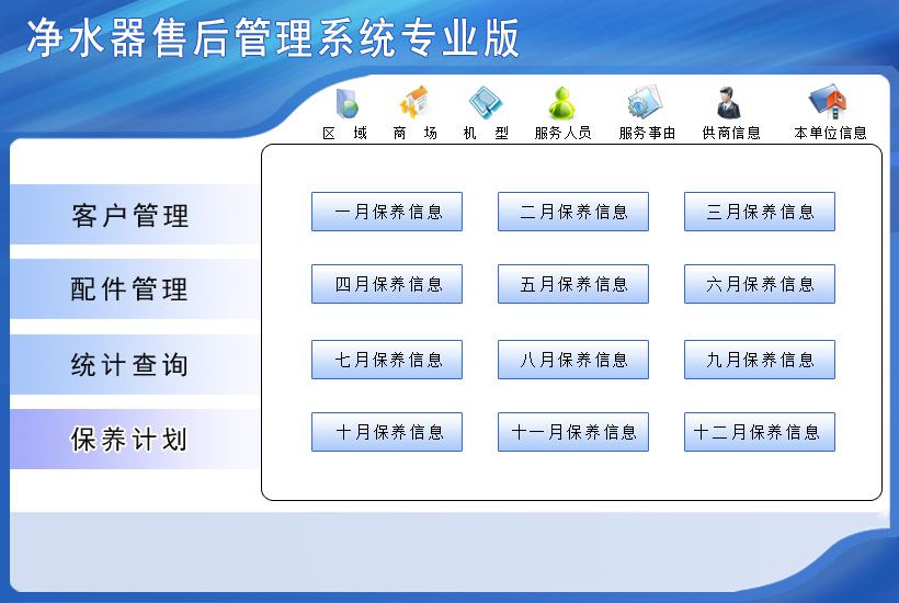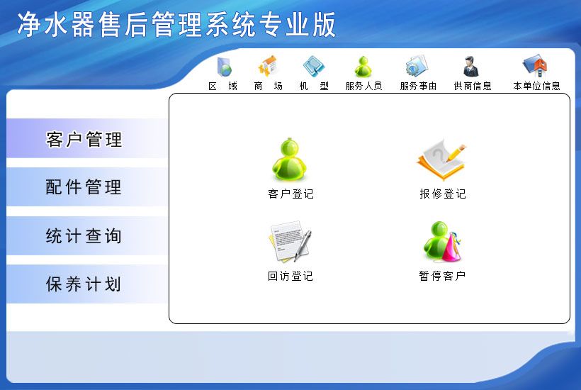 《净水器售后管理系统专业版》是一款适用于净水器售后服务站应用的软件,该系统可以实现对净水器的客户登记、报修登记、回访登记,配件入库、配件销售,配件库存,每个月份的保养计划客户、安装统计、维修统计等功能,是一款有效的管理软件,具体功能包话如下: 该软件的功能主要包括: 1、客户管理(客户登记、报修登记、回访登记、暂停客户); 2、配件管理(配件信息、配件入库、配件出库、配件销售、配件库存); 3、统计查询(安装汇总表、维修汇总表、未完工统计、工资统计); 4、保养计划(一月保养信息、二月保养信息、三月保养信息、四月保养信息、五月保养信息、六月保养信息、七月保养信息、八月保养信息、九月保养信息、十月保养信息、十一月保养信息、十二月保养信息); 5、基本信息(区域、商场、机型、服务人员、服务事由、供商信息、本单位信息);