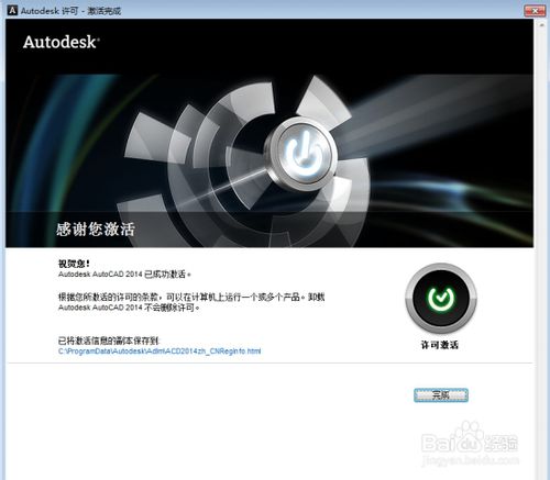 9、最后,点击“下一步”,然后就提示你激活成功,点击“完成”按钮,就可以进入到 auto CAD2014,就算是正式版本了
