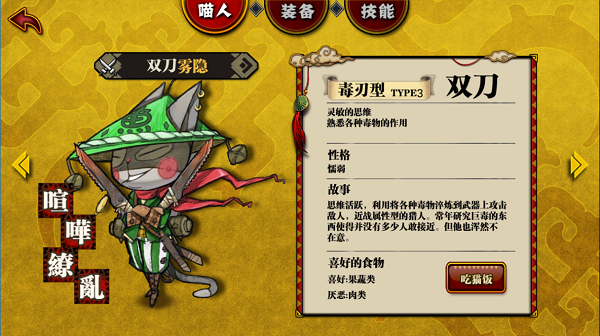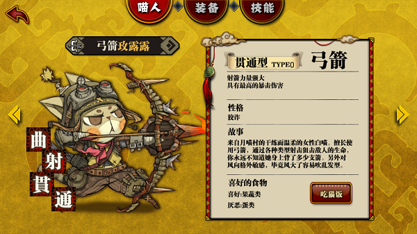 弓箭型喵猎人(下文简称弓箭喵),喵猎人中拥有“洞察之眼”的喵才能领悟弓箭的精髓,并在地形复杂的未名大陆上生存,它们能够敏锐的发现猎物,亦能精准的发现猎物的弱点,从而给猎物带来致命的一击。弓箭喵根据喵人天赋差异可以分为三类:贯通型、曲射型、斥候型。