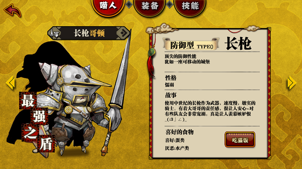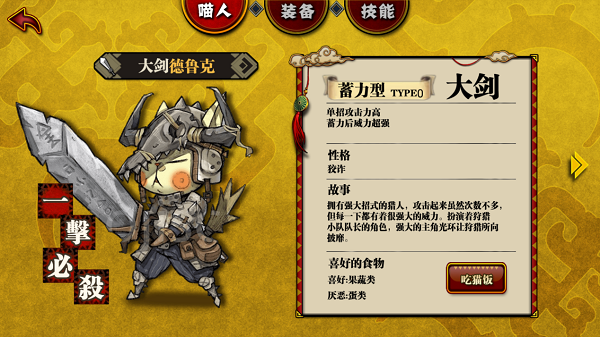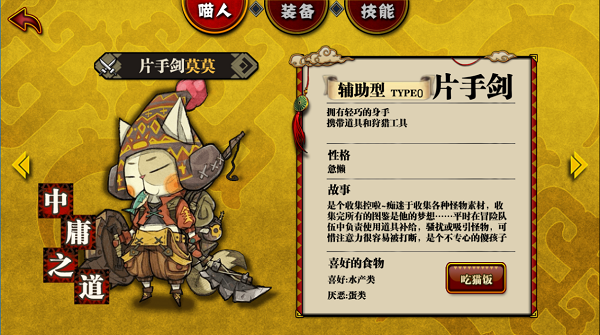 片手剑,其实他们也擅长使用小型盾牌,盾反技艺是他们的拿手绝活。但部分猎团成员后续醉心与研发各种工具与药水,并专门成立了研究实验室,不断开发与迭代;另外一部分喵人依旧专心与狩猎与采集,成为了整个喵村里最了解怪物的喵;还有一部分喵人通过药水走向了战地医生的职业。所以全能之王的队伍中也有三种偏向:辅助型,治疗型,游击型