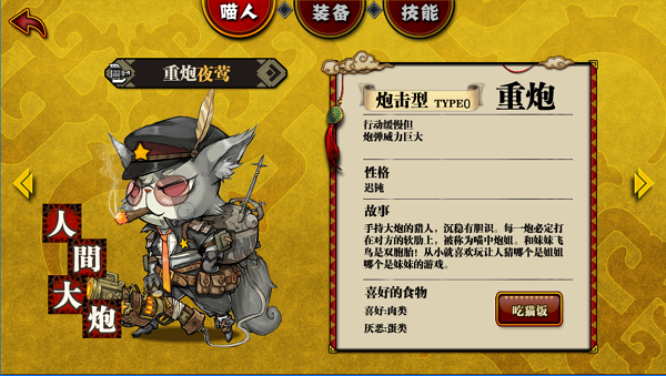 巨炮,喵人中最烧钱的一个猎团,因为炮弹的消耗量实在太大,为其提供弹药的片手猎团每次大战前都会抱怨重炮是资本主义剥削者。虽然片手猎团每次嘴上都在吐槽,但他们却乐忠于开发新型炮弹。而巨炮猎团也随着炮弹种类的丰富与重炮科技的不断提升,逐渐有组织的形成了三个炮兵种类:炮击型,属性型,炸弹型。