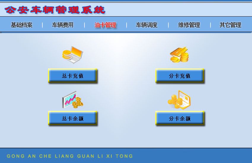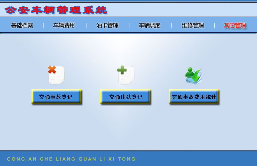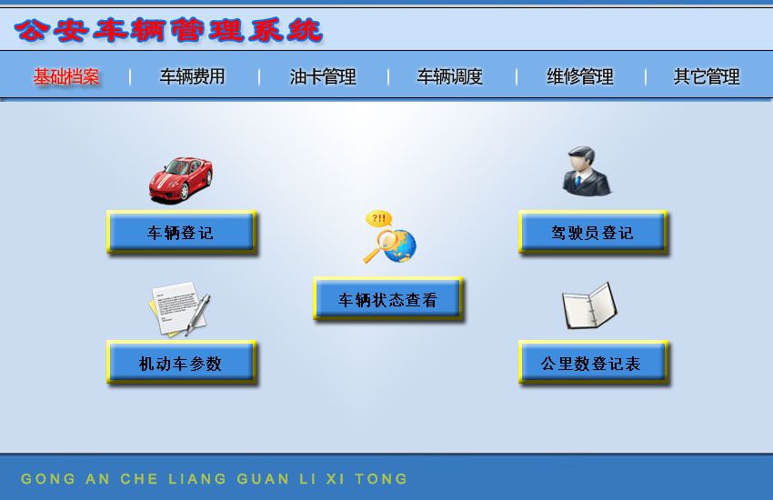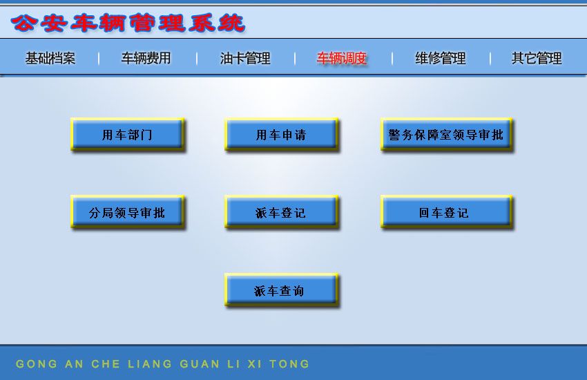 《公安车辆管理系统》是一款适用于公安机关单位的系统,该系统可以实现对公安机关单位中的车辆档案、驾驶员档案、车辆各项目费用,油卡管理、车辆调度、维修管理、车辆违法登记、事故登记,车辆状态及各项费用到期预警,驾证到期预警等功能能,是一款有效的管理软件,具体功能包话如下: 该软件的功能主要包括: 1、基础档案(车辆登记、驾驶员登记、机动车参数、公里数登记表、车辆状态查看); 2、车辆费用(费用登记(燃料费用、洗车费用、轮胎费用、保险费用、年审费用、过路桥费用、蓬垫费用、二维费用、其他费用),费用查询(费用合计、车辆费用明细)); 3、车辆预警(年审预警、保险预警、二维预警、驾驶证预警、交通违法预警); 4、油卡管理(总卡充值、分卡充值、总卡余额、分卡余额); 5、车辆调度(用车部门、用车申请、警务保障室领导审批、分局领导审批、派车登记、回车登记、派车查询); 6、维修管理(车辆报修登记、保障室审批、局领导审批、维修明细、维修完工登记、维修查询); 7、其它管理(交通事故登记、交通违法登记、交通事故费用统计);