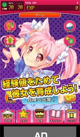 ☆冒险获得经验值☆点击画面即可让少女的飞行高度提升,避开障碍物即可获得经验值和金币,以次来进行爱抚或者扭蛋!冒险需要体力,体力会逐渐恢复