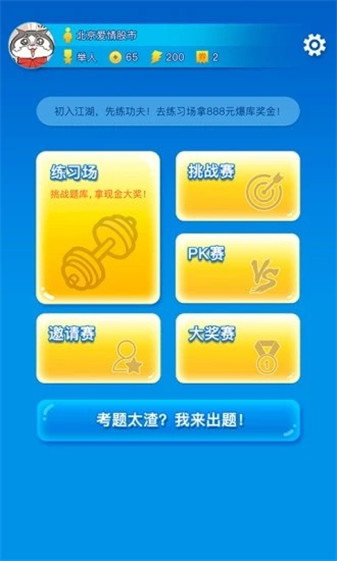 泡椒答题为游戏玩家提供了多种答题玩法:1)、练习场:供用户进行答题练习、修炼等级,获取爆库(答完题库)现金大奖;