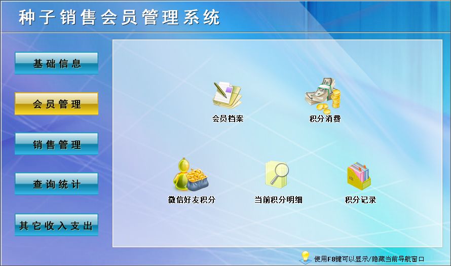一、基础信息:品种设置、公司设置、礼品设置、人员信息、数据初始化二、会员管理:会员档案、积分消费、微信好友积分、当前积分明细、积分记录