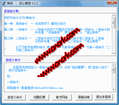 动心音控,语音控制您的电脑!使用本软件,必须安装微软公司出品的语音引擎,没有的话,“后台管理”里面有下载地址的。目前只支持中文语音,暂不支持英文. 如果您有任何使用问题,或者软件问题,请点击“后台管理”里面的“问题反馈”提交给作者。有您的支持,我们会做的更好!在软件启动后,您可以对着图片单击右键,或对着麦克风说:帮助。 就可以打开帮助面板.在帮助里面点击“自定义”。就可以进入后台管理!
