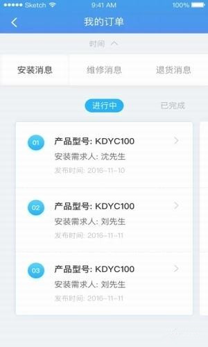 4、订单管理,以预约订单,正在进行订单,已完成订单,订单的不同时刻分部管理,让师傅的安装工作仅仅有条