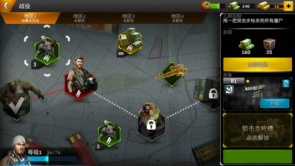 1.击杀僵尸群拯救被困的幸存者,用一组火力强大的武器整肃僵尸横行的地区