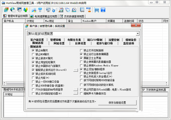 9、HotView除了查看功能以外还是有局域网管理功能, 可以禁止QQ、禁止聊天工具的运行, 禁止下载, 禁止安装软件, 禁止游戏, 禁止USB, 布置设置只能运行与工作有关联的软件, 控制上网, 只能访问指定的网站或者屏蔽某些网站, 限制流量以及远程协助的功能。