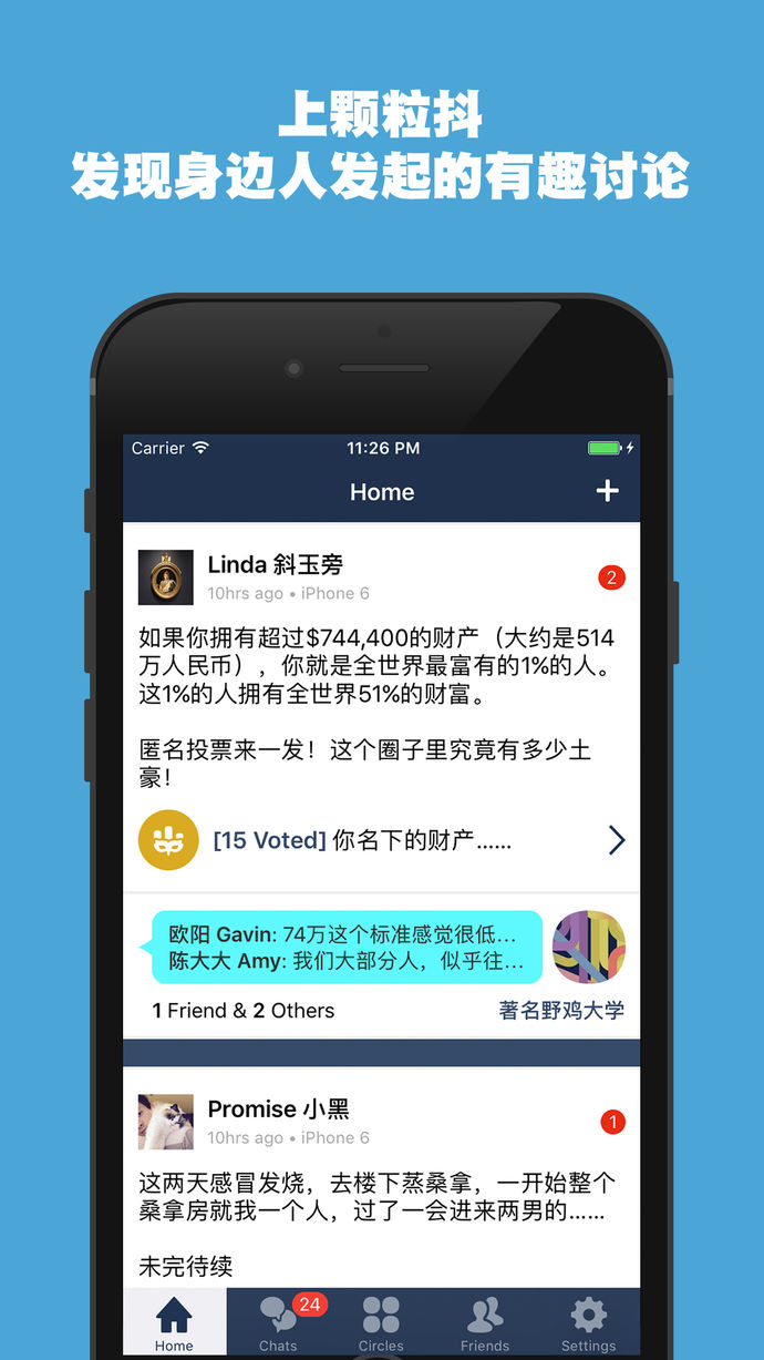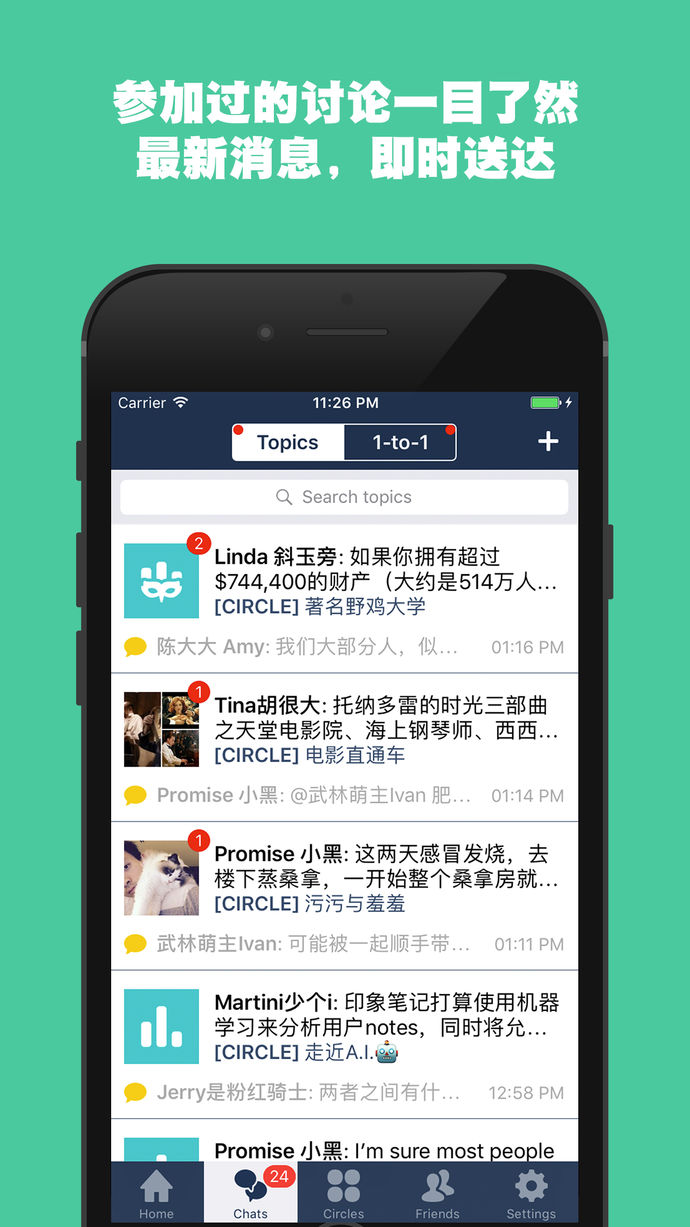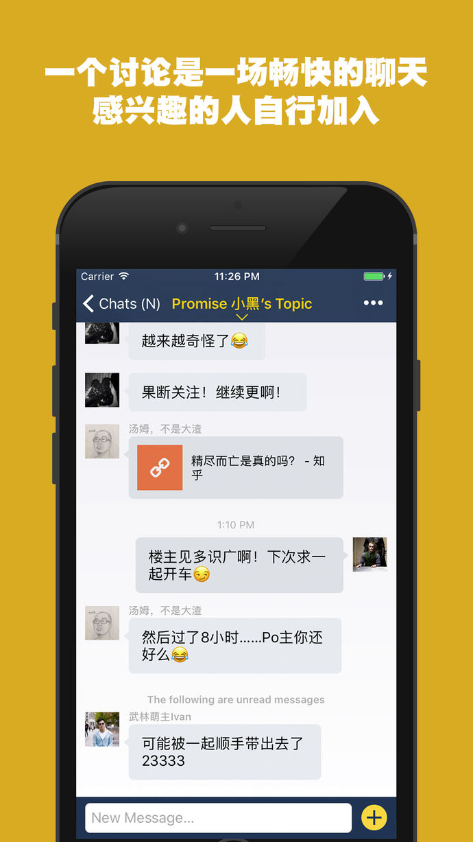 + 想聊什么,就聊什么,话题随心所欲——几句话、几张照片、 一个投票、几个网址或一段视频——风花雪月柴米油盐阳春白雪下里巴人,你想聊什么?+ 每个话题都是一个单独的群聊,想聊多长就聊多长——愿者自来,不感兴趣的也不会被打扰,还能根据话题找到你想要的信息