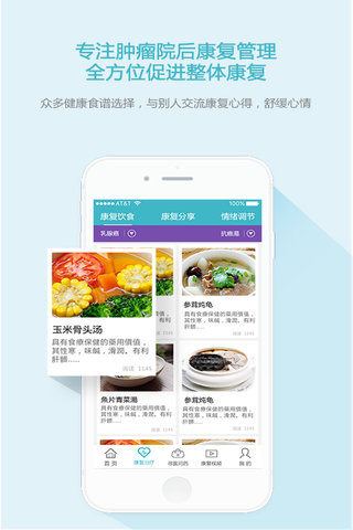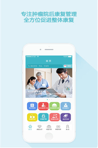 “康复治疗”有“康复饮食”、“情绪调节”和“运动调节”三个子栏目。“康复饮食”有上千种肿瘤康复食谱,菜方、汤方、粥方、茶方等各种饮食,可任肿瘤患者挑选。“情绪调节”精选音乐疗法中的经典曲目,并分门别类,可有针对性地消除肿瘤患者的悲哀、愤怒、急躁、绝望、压抑等消极情绪。“运动调节”精选了简单、易学、有效的抗癌操等视频,可让肿瘤患者快速掌握有氧运动,促进整体康复。