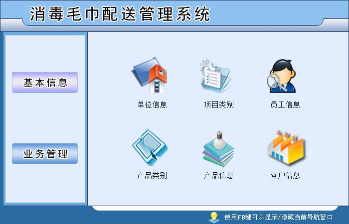 《消毒毛巾配送管理系统》是一款适用于向各种理发店、宾馆、酒店配送消毒毛巾行业的一款软件,软件集配送、收回、统计与一体。软件界面设计简洁、美观其人性化的管理可以使用户轻易上手,大大节省工作时间,提高工作效率。科学的管理方法会给您带来无限的效益,消毒毛巾配送管理系统将是您明智的选择。 《消毒毛巾配送管理系统》包括如下功能模块: 基本信息:单位信息、项目类别、员工信息、产品类别、产品信息、客户信息 业务管理:配送登记、配送收回、配送明细、配送查询、财务统计
